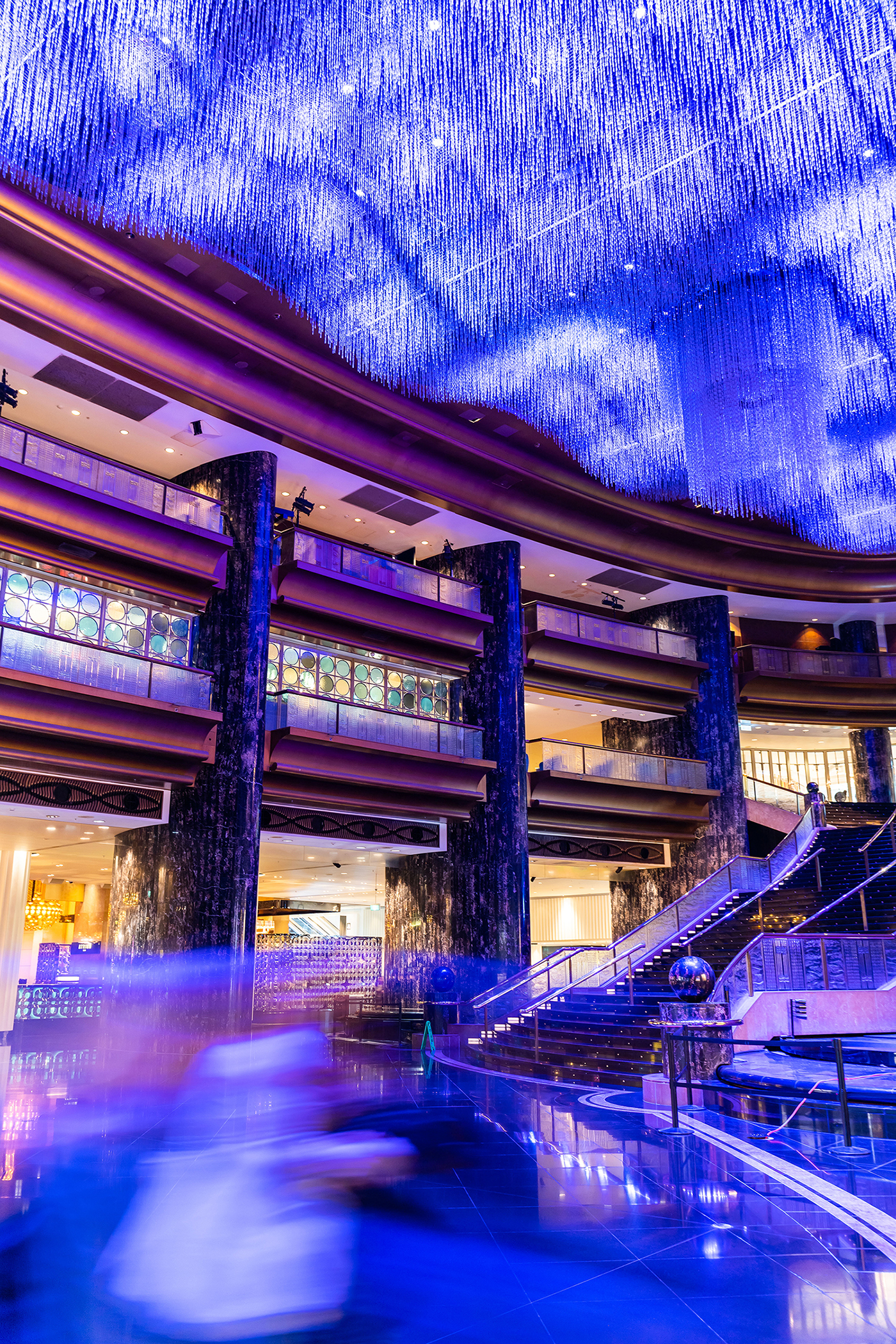 The development process involved illuminating the logo through the use of power-coated gold aluminium perforated panels and LED modules. 54 LED digital panels were custom designed, manufactured and then installed around a cylindrical totem inside the casino.