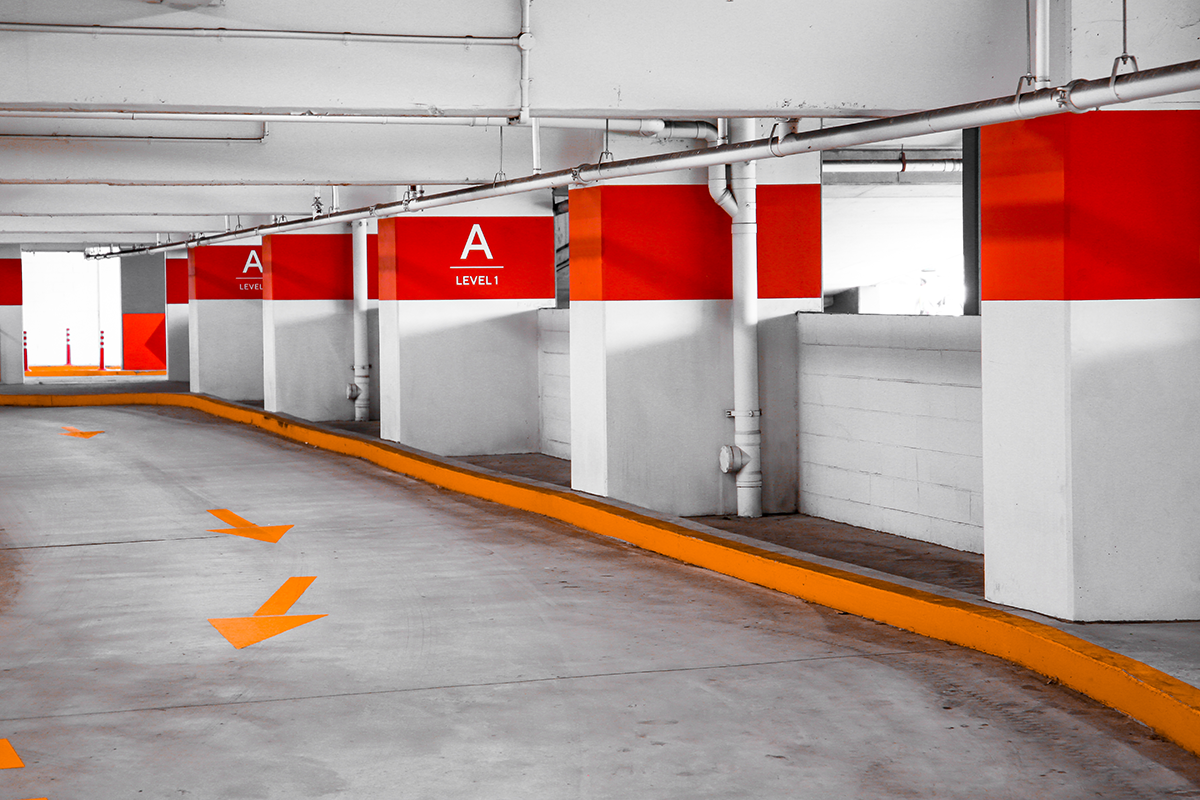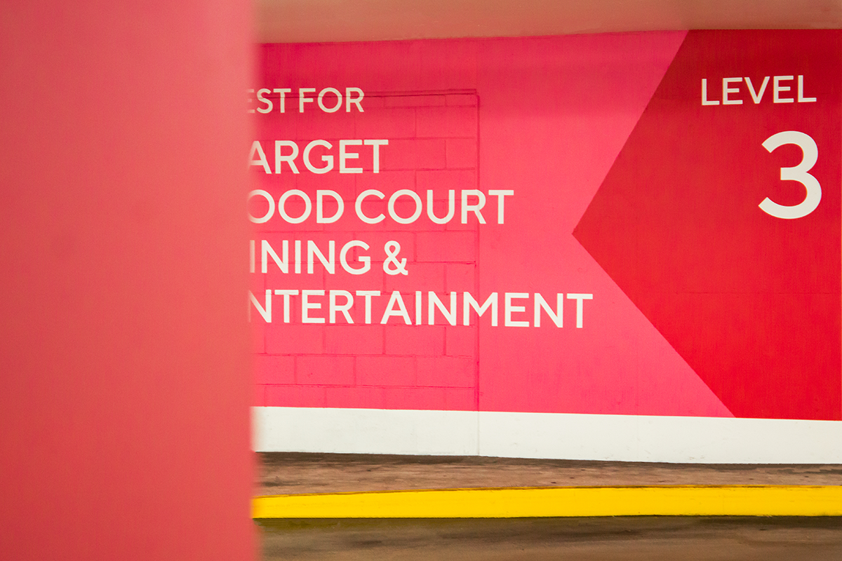 The large-scale, visually impactful directional supergraphics were applied to the concrete surfaces using a mask and spray method, which allowed for precise lines, bold graphics and an overall consistent aesthetic across each level.